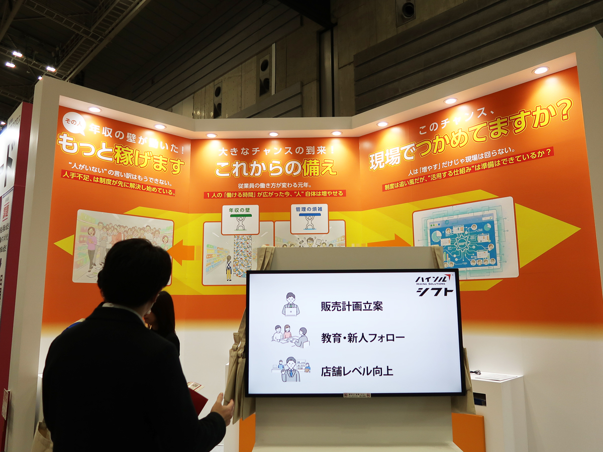 さらに、シフト作成・作業の割り当てなど店舗スタッフの働き方の多様化を支援する「ハイソルシフト」といった店舗DXを手掛けるHRソリューションズが出展。年収の壁が上がろうとしている現在、煩雑なシフト管理をDXで支援するシステムを紹介している。