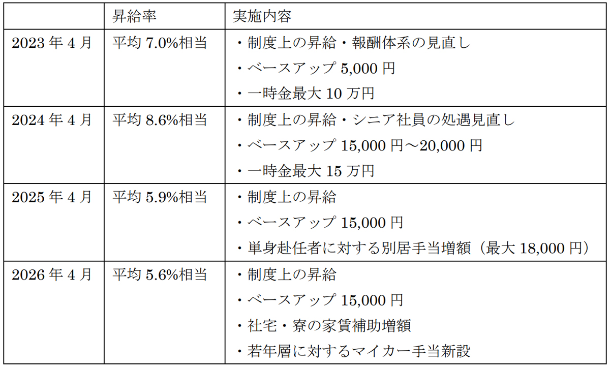 2023年4月から4年連続のベア実施となる。これにより、4月入社の大学卒新入社員の初任給は月額28万円となる。