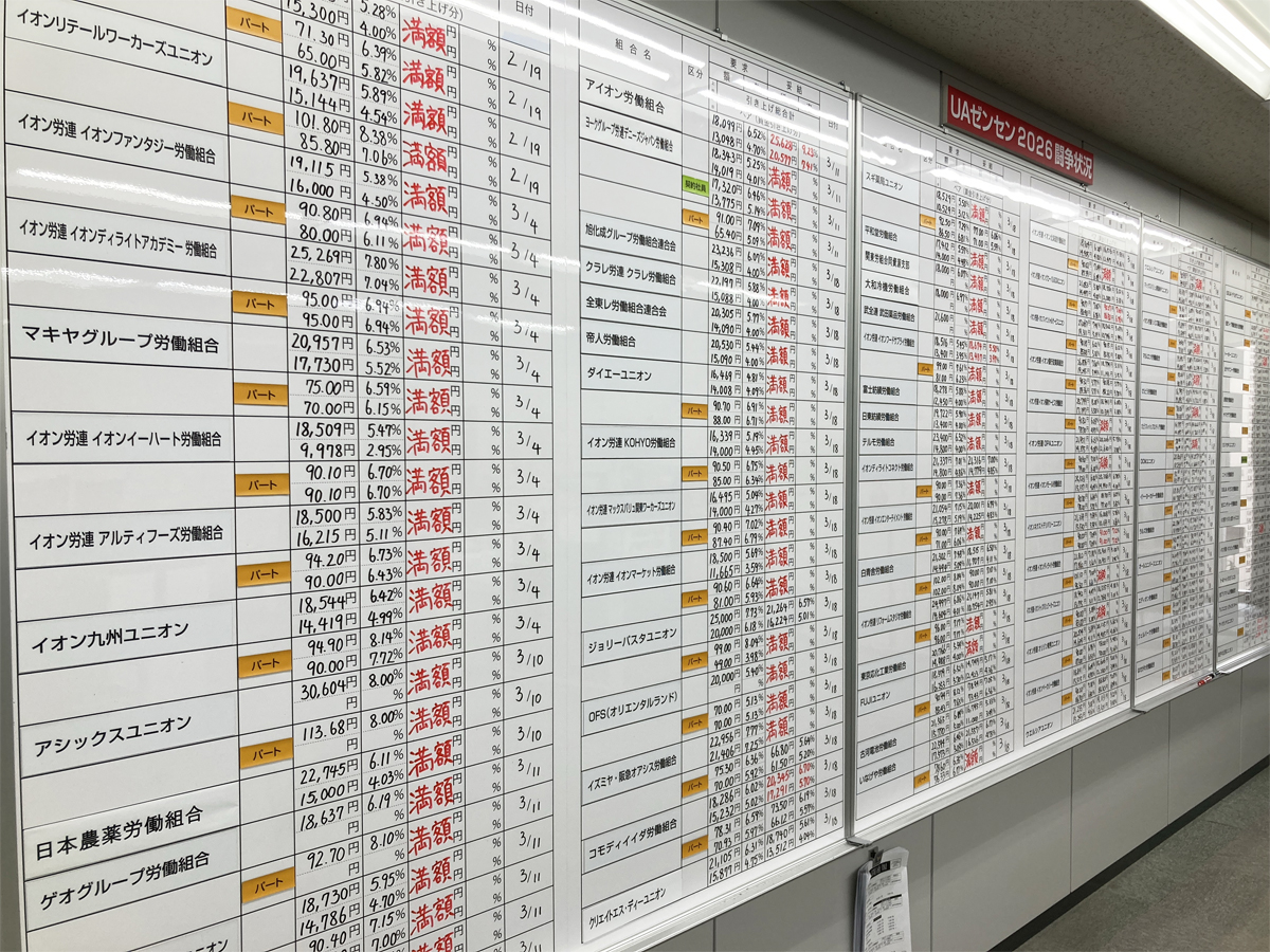 UAゼンセンは3月19日、2026年労働条件交渉1回目の集中回答日の集計を発表した。それによると、正社員142組合、パート99組合、契約社員15組合(計87万6000人強)で、組合員の賃上げが決まった(同日10時時点)。