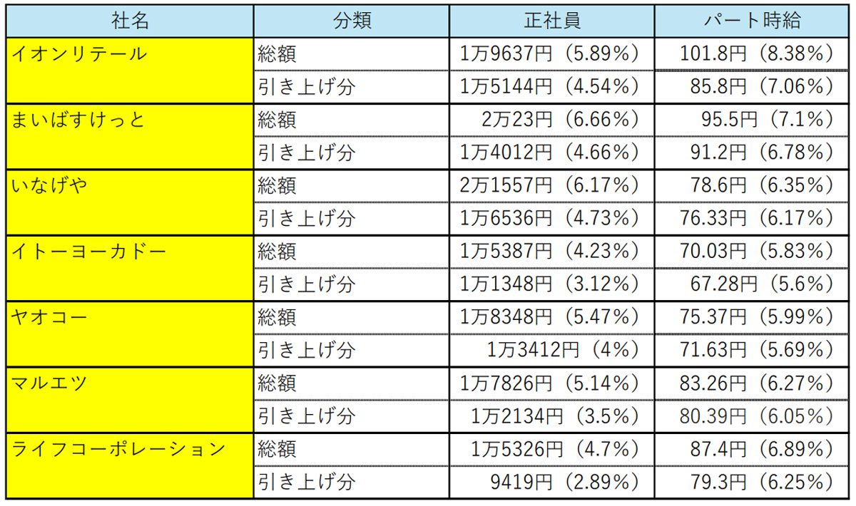 また、イオンリテールは正社員、パートともに4年連続の満額回答。パート時給賃上げ総額101.8円は、同組合過去最高額となった。