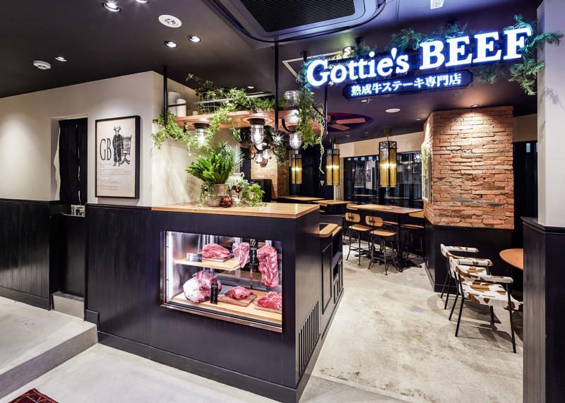 「Gottie`s BEEFは、TIME is YUMMY(ごちそうの時間)をコンセプトに、ドライエイジングという製法を用いて約40日間じっくり時間をかけた、赤身の旨味がたっぷり詰まったこだわりの熟成牛をミドルプライスで提供する」(同社)。