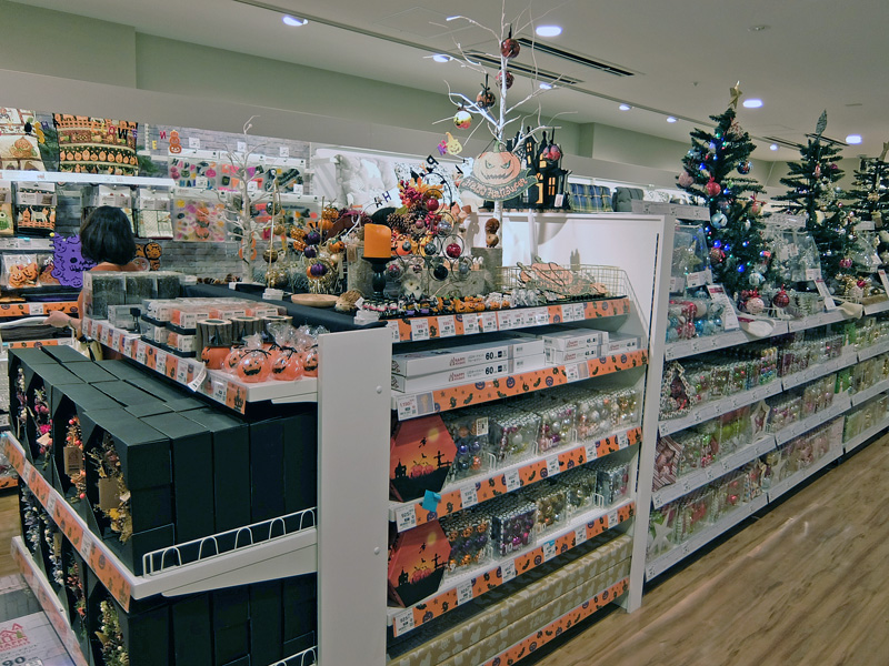1階のレジ前には、季節商品を展開。昨年から販売を始めたハロウィン向けの商品のほか、クリスマス関連商品もいち早く販売する。季節商品を早い段階で打ち出すことで、流行に敏感な層の購買を促す。