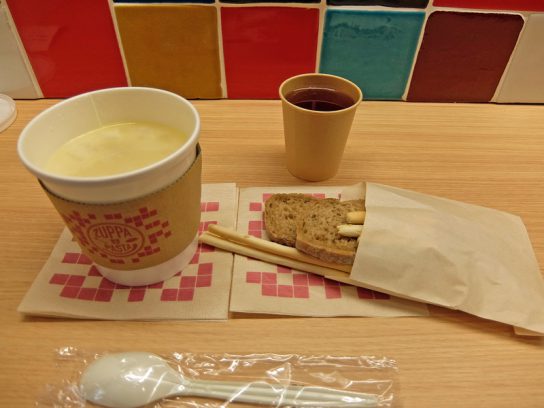 スパゲッティマリアーノとズッパ・ディ・パスタはともに、忙しいビジネスパーソンをターゲットとした業態のため、持ち帰りに対応できる使い捨ての容器で商品を提供している。