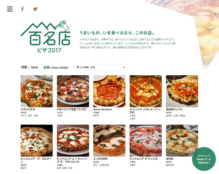 食べログの「ピザ」ジャンル掲載店は全国約8600店。そのうち2017年8月末時点でユーザー評価の高かった100店が選ばれた。