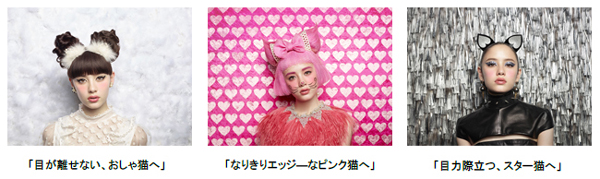 なりたい仕上がりにあわせて、「目が離せない、おしゃ猫へ」、「なりきりエッジ―なピンク猫へ」、「目力際立つ、スター猫へ」の3パターンを用意した。
